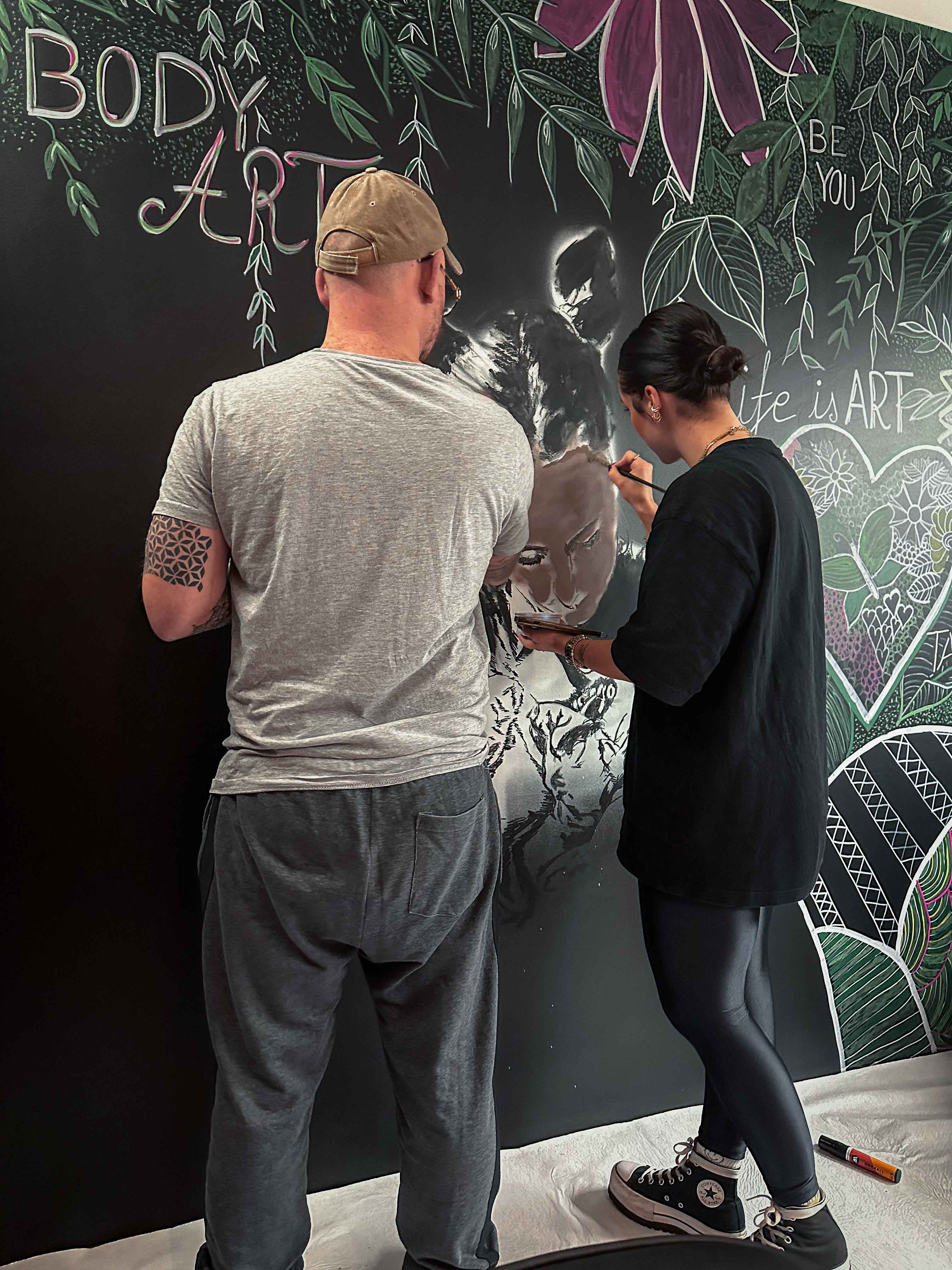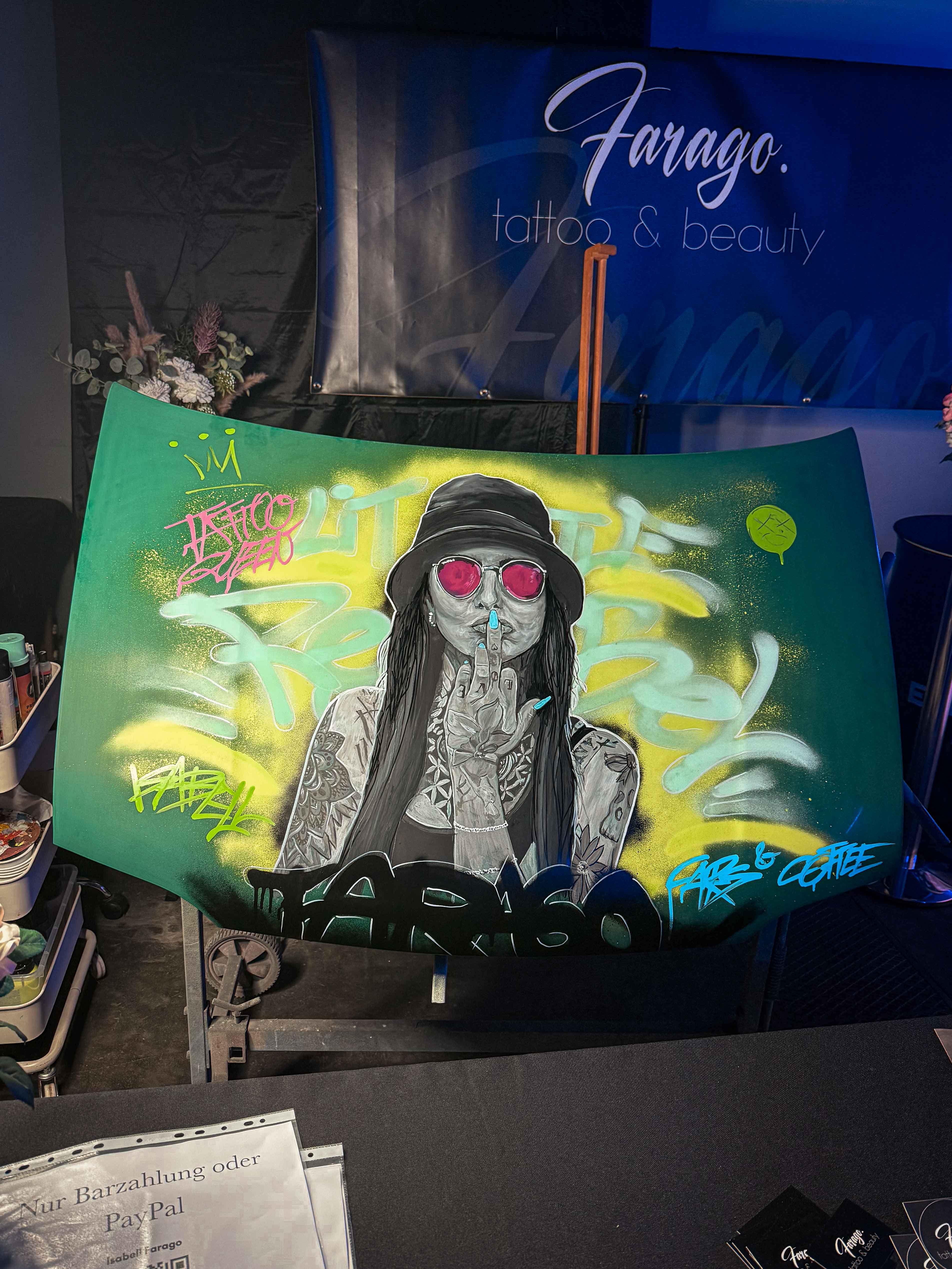Unter Anderem haben wir ein Portrait auf eine Motorhaube gemalt, eine Wand in der Sunshine Bar und im Sunshine Hairlove in Achern, sowie eine Wand im Farago Tattoo Studio.